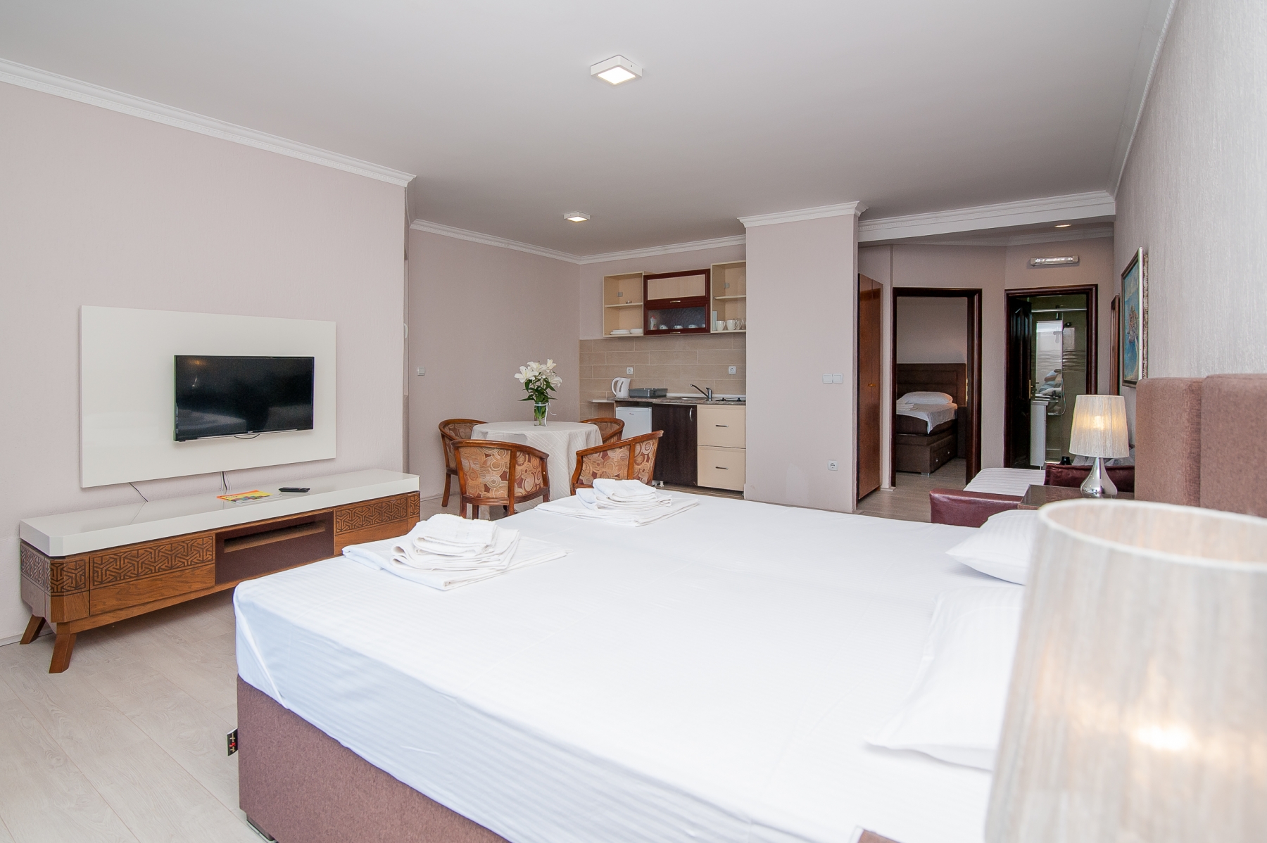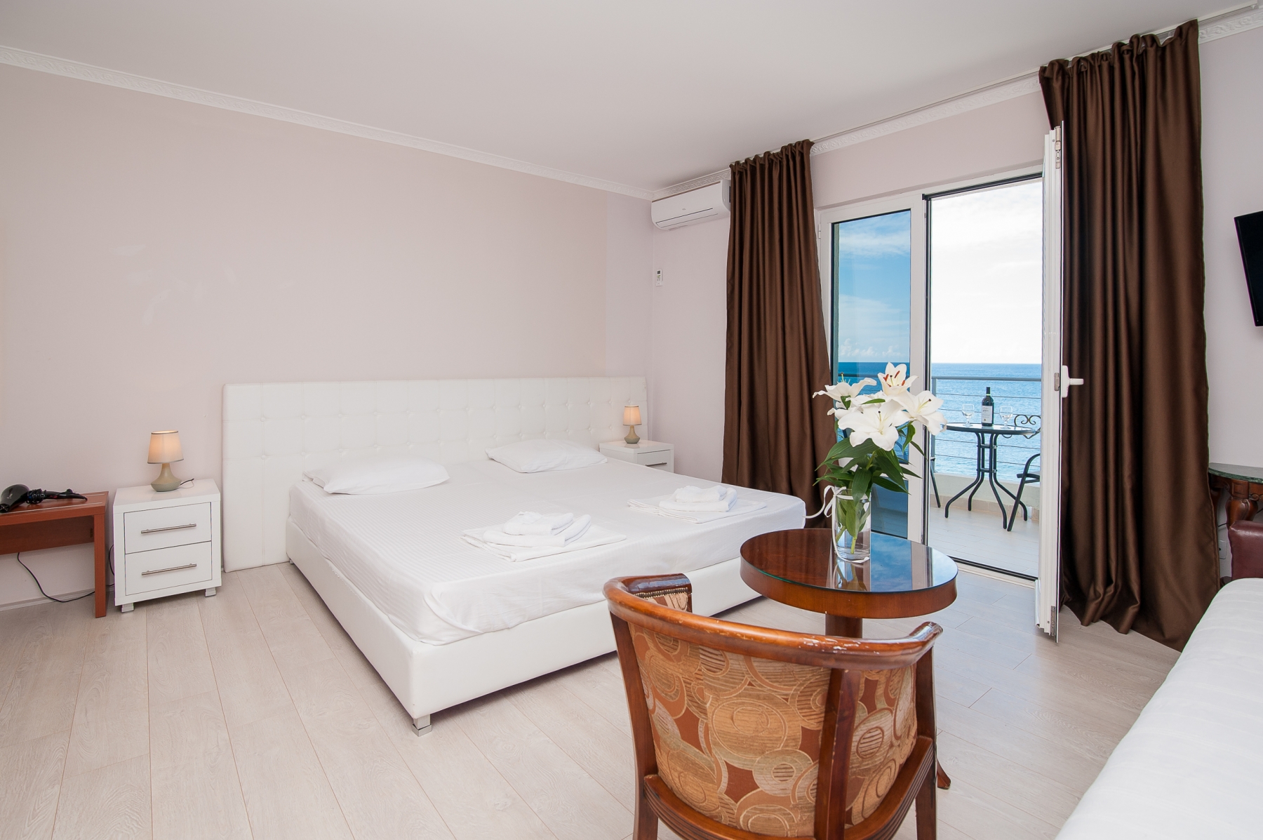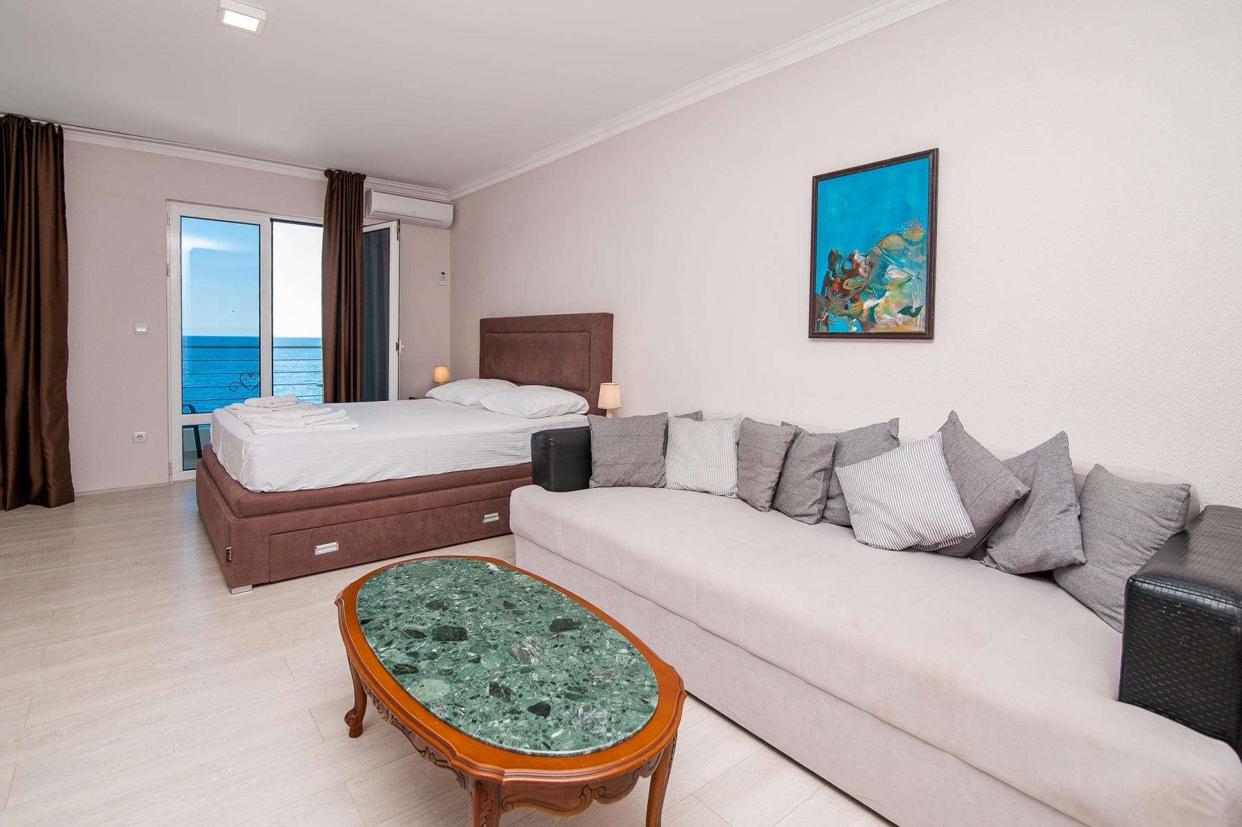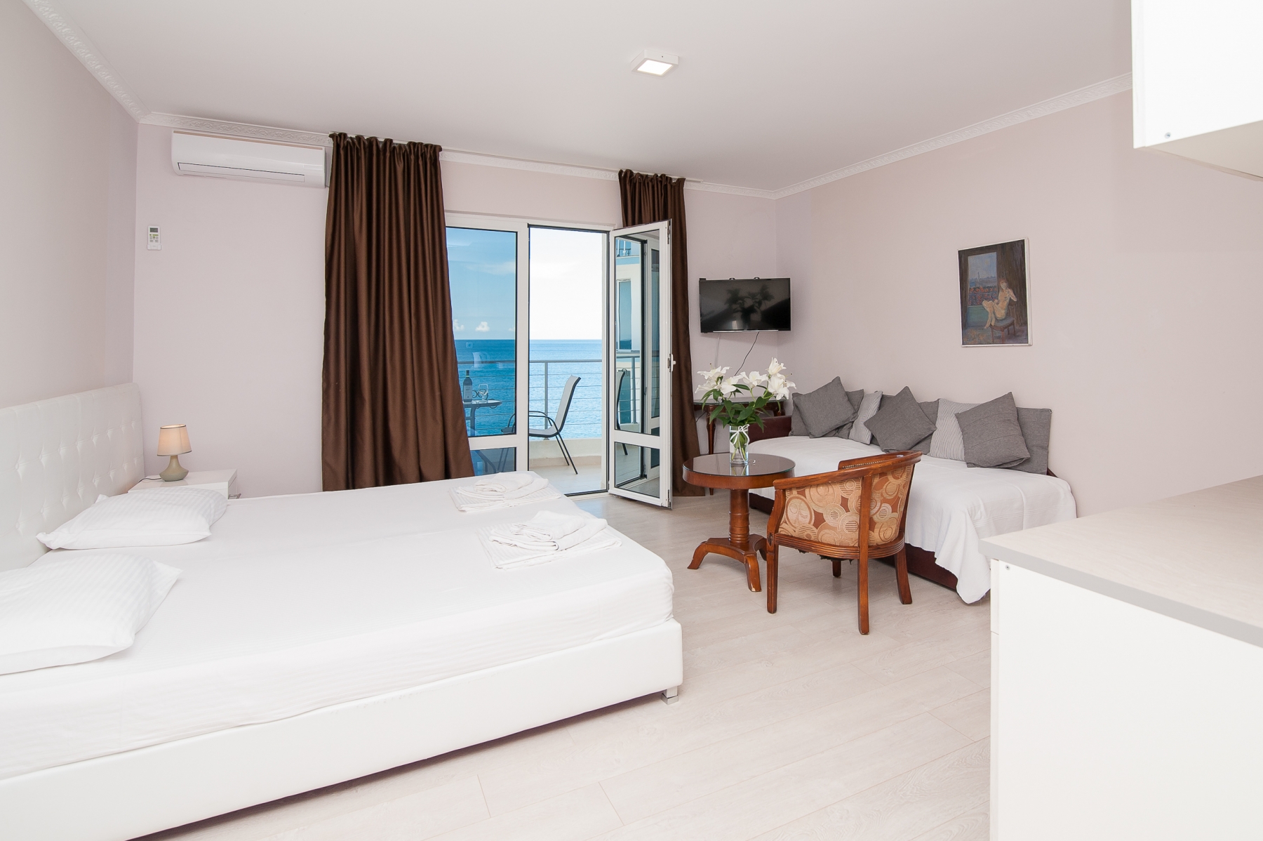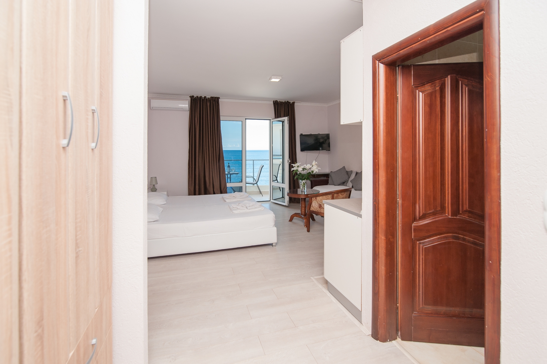 Open Sea Luxury Apartments se nachází v Utjeha, který je známý svým klidem, krásnými plážemi a krásnou přírodou. Útěcha je známá také velmi čistou vodou v moři, kde kromě plavání můžete také rybařit a potápět se. Přesné umístění je klidnou částí takzvané útěchy. Cold Bay. Toto umístění poskytuje vzdálenost od shonu velkého počtu lidí, silnic a dalších zvuků. Komplex je jen 30 metrů od moře. V blízkosti komplexu je několik menších oblázkových pláží s mírným vstupem do ideální vody pro děti. Zde jsou betonové i skalnaté pláže, které dávají hostům na výběr, kterou pláž chtějí plavat a odpočívat daleko od bytu, ne více než 70-100 metrů.Hotel Open Sea Luxury Apartments jsou dvě vily. Villa 1 Počínaje čtyřmi podlažími, ve kterých je dvanáct apartmánů (8 se dvěma ložnicemi, jeden uzavřený, druhý otevřený prostor má velkou manželskou postel, která slouží jako ložnice a obývací pokoj kombinovaný s jídelnou a kuchyní a 4 studia) vila, 2 zatím pouze s jedním patrem a dvěma apartmány se dvěma ložnicemi, jeden uzavřený, druhý otevřený prostor má velkou manželskou postel, která slouží jako ložnice a obývací pokoj kombinovaný s jídelnou a kuchyní. Kapacita apartmánu je 5-6 osob a studia až pro tři osoby. Všechny apartmány ve vile 1 mají výhled na moře. Každý apartmán má dvě ložnice (jedna uzavřená), vysoce kvalitní nábytek, vlastní balkon (každý s velkou ložnicí má vlastní balkon), chodba, velká kuchyň, klimatizace v hlavní místnosti, ventilátor v ložnici, WIFI a LCD TV se satelitními programy (FTA). Studiové apartmány mají vstupní halu, kuchyň, koupelnu, balkon s výhledem, klimatizaci, Wi-Fi a satelitní LCD TV (FTA).