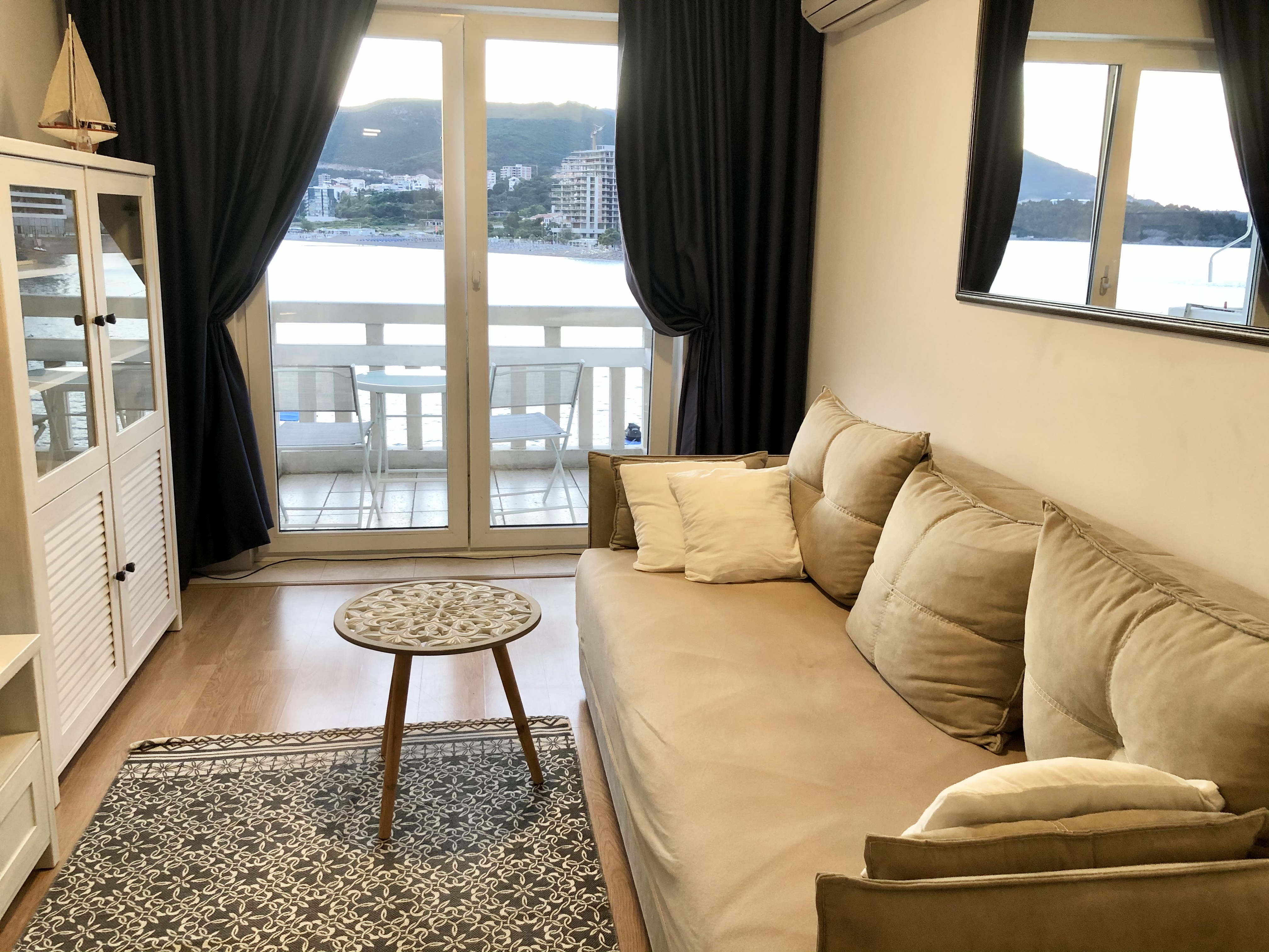 Apartment on the first line to the sea with a beautiful sea view. It has two bedrooms, each with a double bed. In the living room there is a sofa that also pulls out into a double bed. The apartment is modernly equipped.