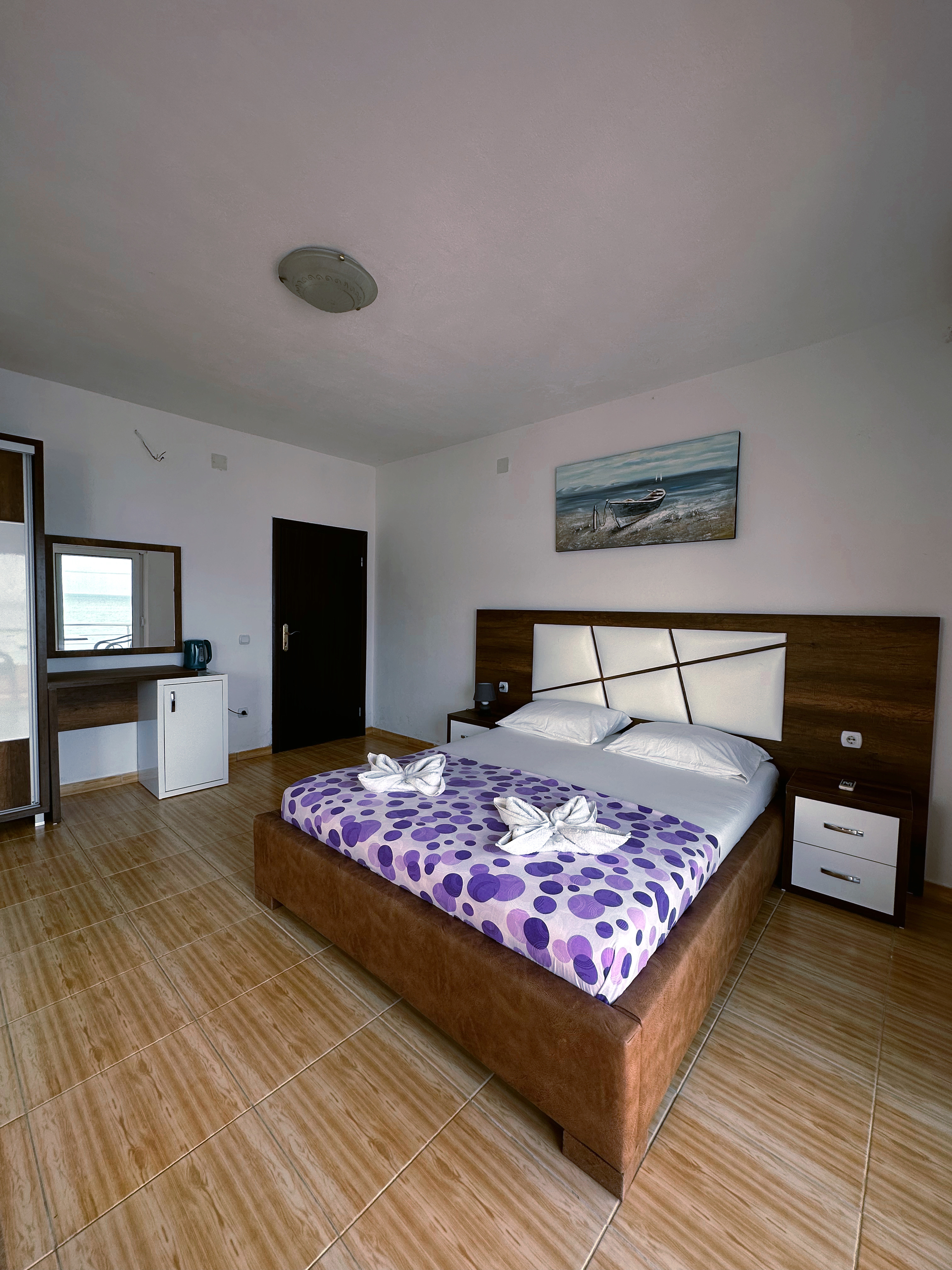 Apartmani su u potpunosti opremljeni novim mobilijarom, sa zasebnim kupatilom, mini barom, televizorom, klima uredjajem i terasom sa pogledom na more. Obezbedjen je i parking prostor.