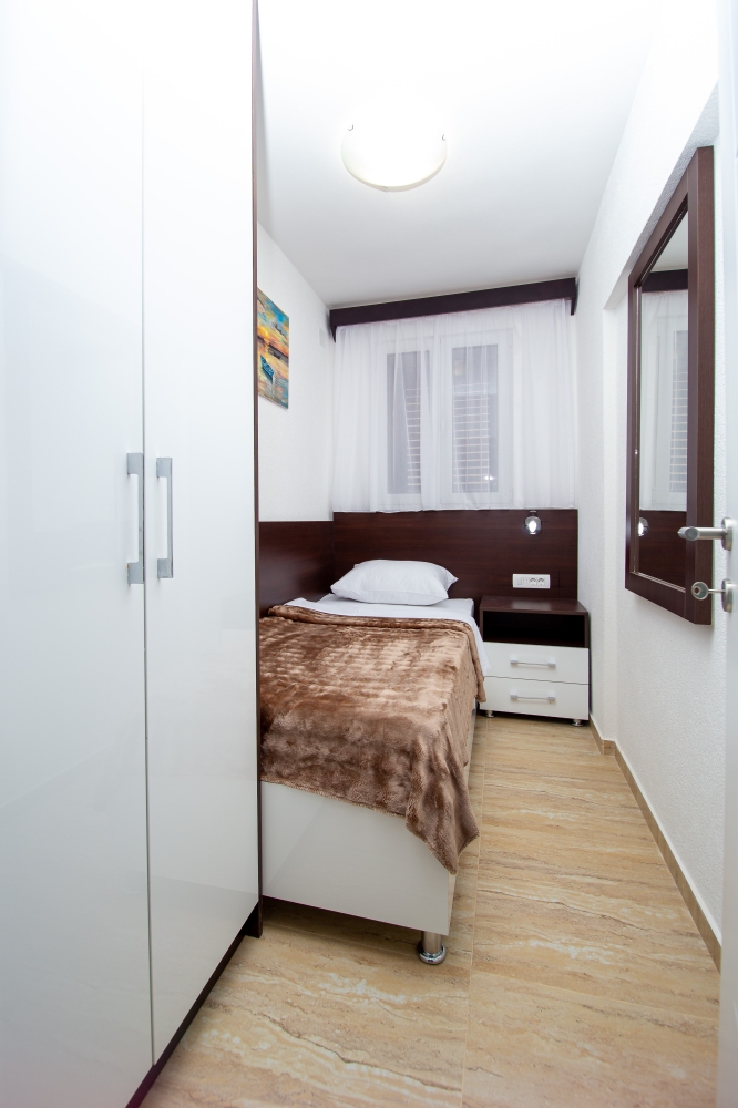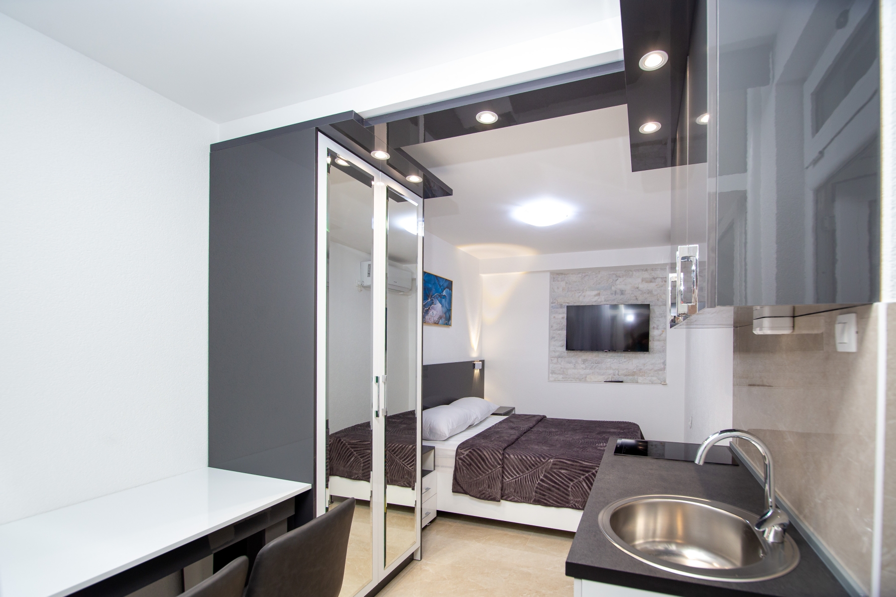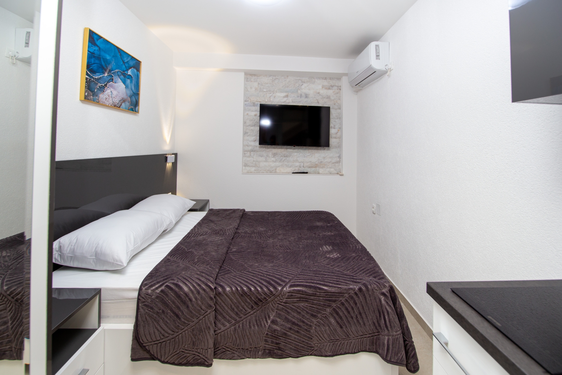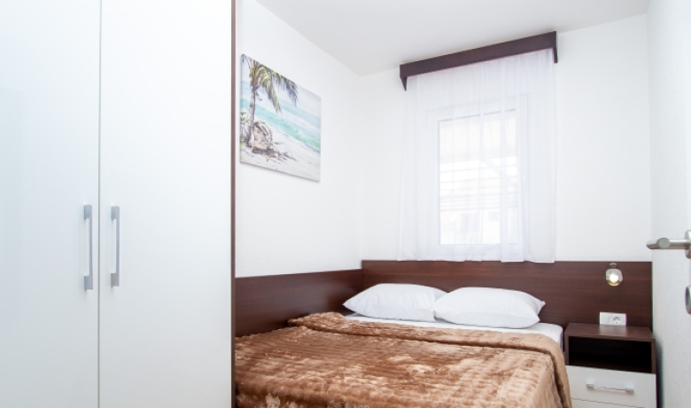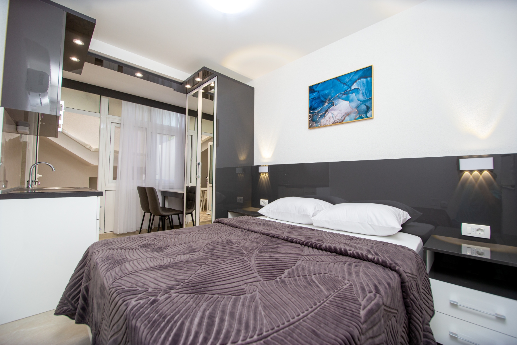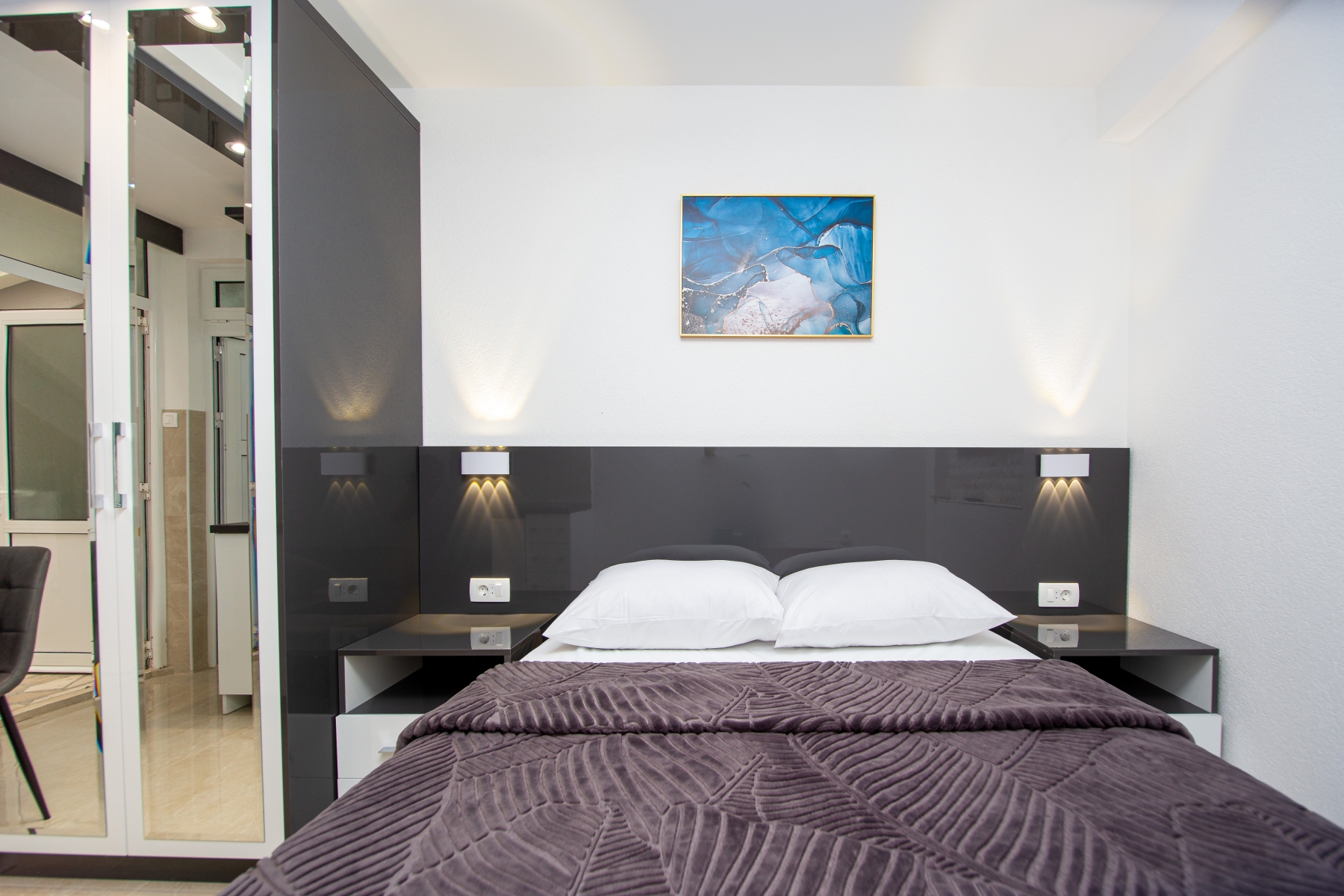 Apartamentet qe trajtohen si studio ndodhen ne nje pallat te vecante qe sherben vetem per te ofruar sherbime turistike ne Petrovc rruga V nr 17. Gjendet 350m nga plazhi i qytetit dhe 100m nga restoranti dhe dyqani i pare. Qendra ku ndodhen posta, banka, qendra shendetesore, marketi dhe dyqane te tjera mund te arrihet ne 7-8 minuta. Vizitorët mund të përdorin gjithashtu plazhin e dytë Lucice, i cili është pak më larg nga qyteti dhe ku ka disa restorante dhe kafene jo-bordi. Aty pranë ka edhe disa fusha sportive dhe kënde lojërash për fëmijë. Çdo njësi ka një banjo, mini kuzhinë me të gjitha pajisjet e nevojshme, kasafortë, TV me programe të shumta, kondicioner dhe internet falas. Mysafirët kanë në dispozicion tarracat me orenditë e nevojshme dhe pallati ka numrin e duhur të hapësirave të parkimit. Ne pallat ka nje sherbim sherbimi, i cili miremban apartamentet, nderrohen liroret cdo pese dite dhe peshqiret cdo dy dite. Ne kemi gjithsej 10 njësi apartamentesh me strukturën e mëposhtme:3 dopio (krevat dopio) - 1 studio klasike, 1 luks dhe 1 luks i ri.5 treshe (një krevat dopio dhe një tek)2 krevate katërfish (dy krevate dopio).